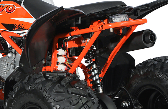 车架采用华洋赛车专利设计的车架结构,在同级别产品中强度最好,重量最轻。充分发挥了运动车的灵活、轻便的特征,使得整车操控更加轻盈、灵活。