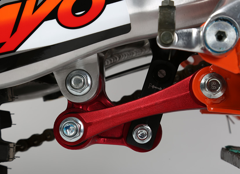 ?全新优化设计的铝摇臂系统 。全新设计的缓冲的角度,配以升级后的后减系统,大跳再也不会出现冲底现象,让你的场地跳跃更轻松。在满足强度的情况下,采用铝摇臂系统,轻度好,耐冲击,使你在颠簸的道路上,将震动尽情消减,恶劣地形如履平地。